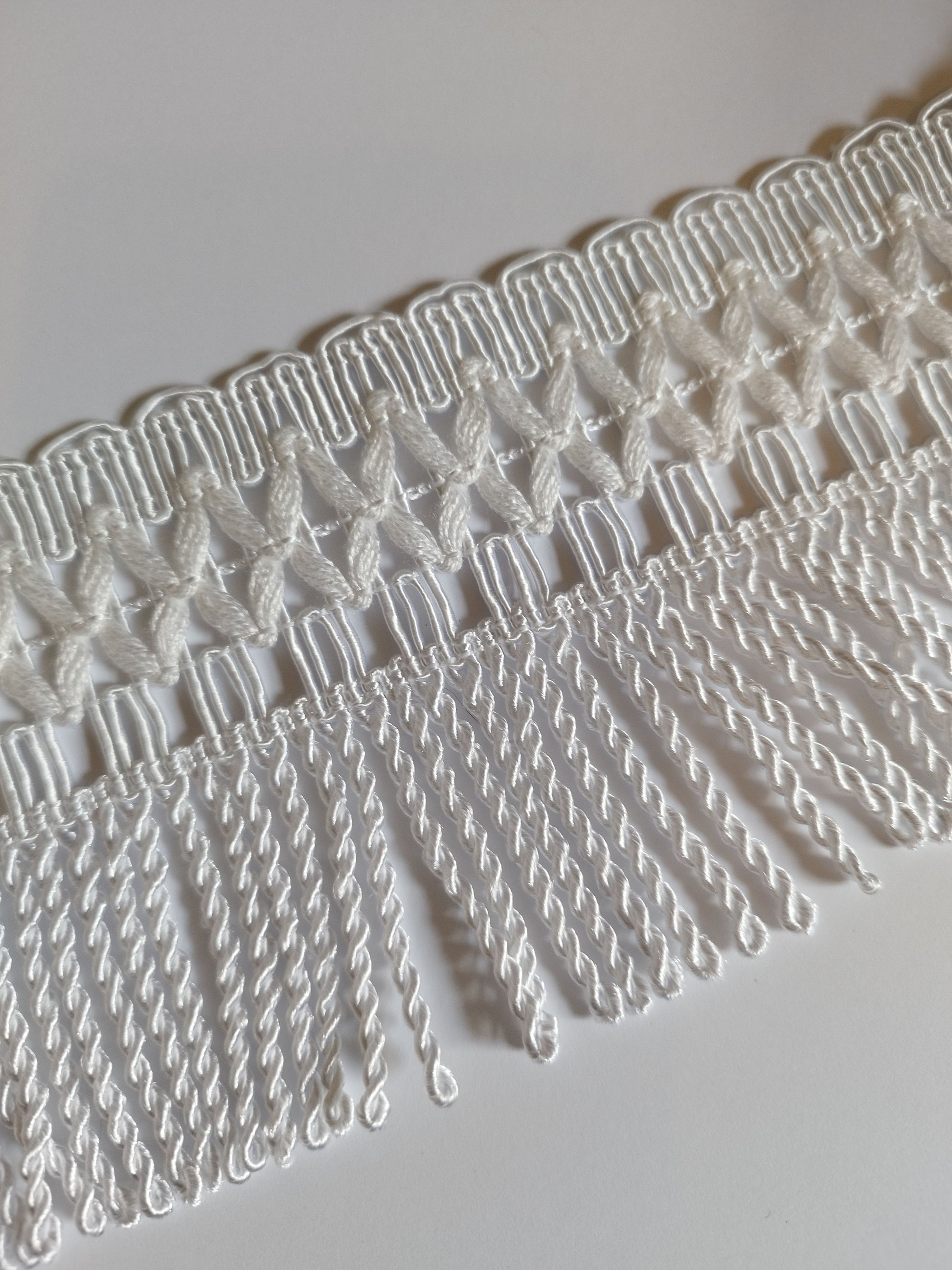 Thick bullion fringe with an unusual "macrame style" heading . 10cm wide. Available in 12 beautiful colours,