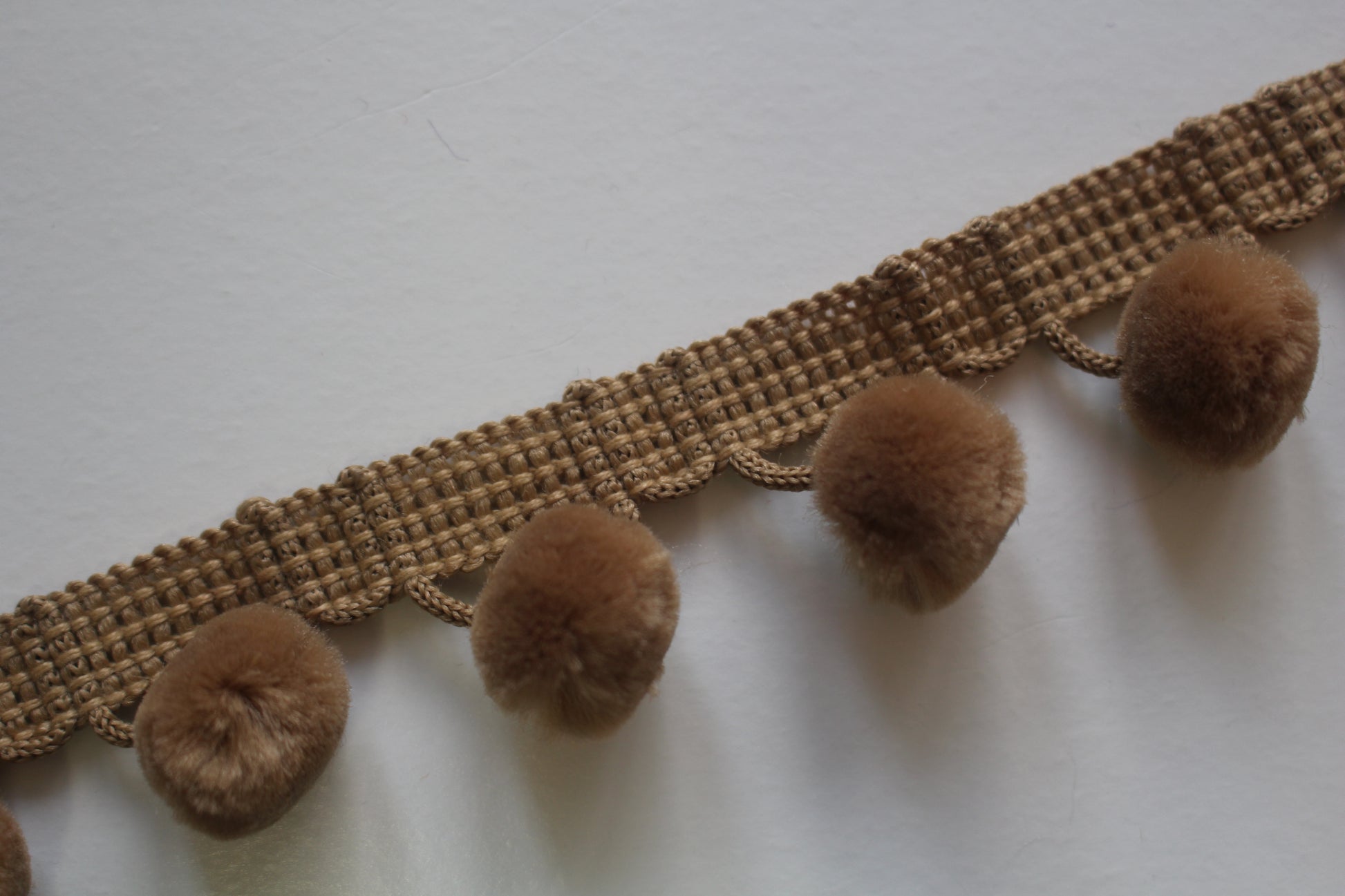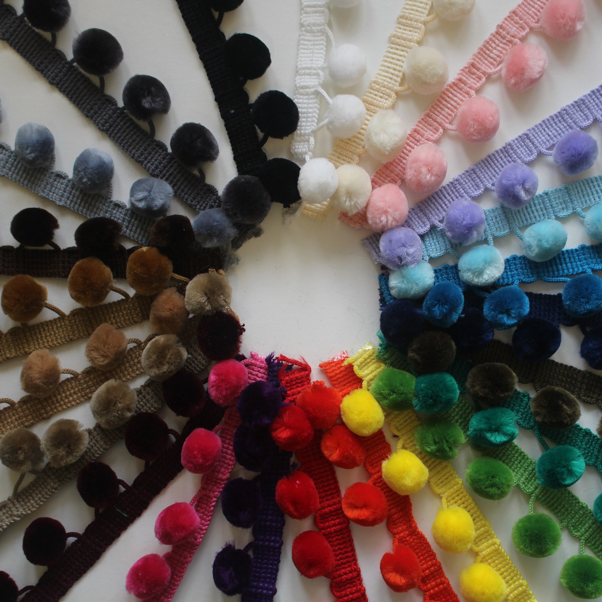 Beautiful plush velvet pom pom trim in a range of lovely colours. This is a great size trim to suit most soft furnishings. Each bobble is about 15-18mm in diameter they are hard to measure as they're so fluffy!) and the whole trim is just over 30mm across. There are 23 colours to choose from. Available by the metre (orders for several metres will be sent as a single length) or buy a whole 11 metre (12 yard) reel at a discounted price